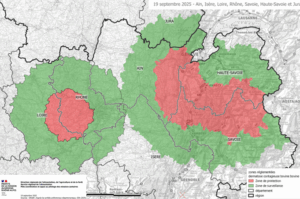 Un nouveau foyer de DNC a été confirmé dans le Rhône le 18 septembre dernier, dans un élevage de vaches laitières. Cet élevage, situé en
